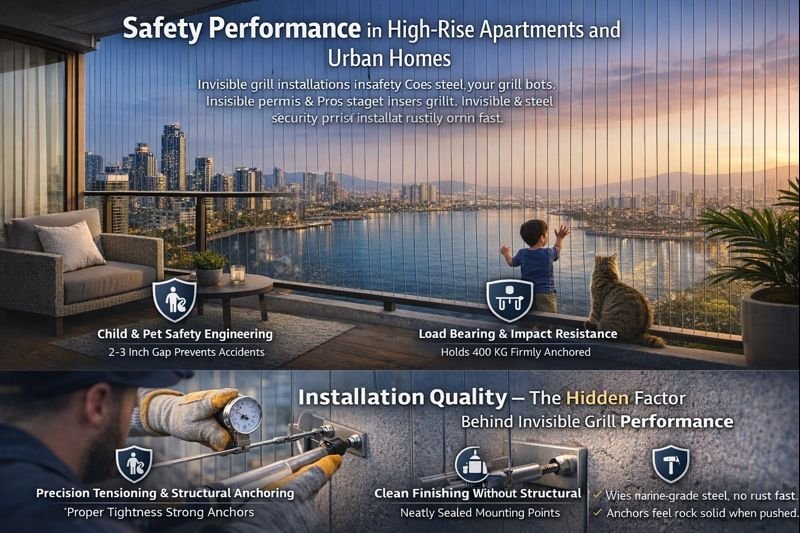 Quality invisible grills use stainless steel cables that hold over 400 kg of pressure. It resists push or lean hard, like rope bridges carry heavy loads. Fix firmly to the wall with strong anchors. Then it will withstand wind and impact on the high floor (check professional installation for this).