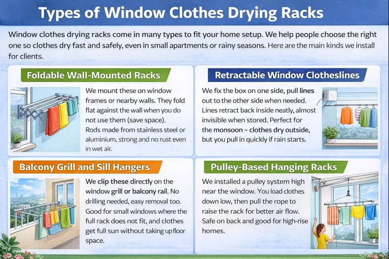 Window clothes drying racks come in many types to fit your home setup. We help people choose the right one so clothes dry fast and safely, even in small apartments or rainy seasons. Here are the main kinds we install for clients.